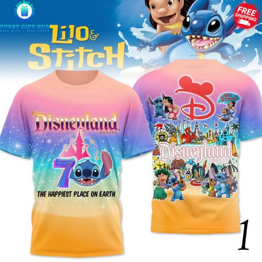 This Lilo And Stitch Disneyland 70 The Happiest Place On Earth Special T-Shirt is a delightful fusion of character charm and anniversary celebration.