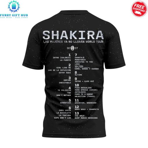 - This stylish black T-shirt features vibrant graphics that prominently display “SHAKIRA” and “LAS MUJERES YA NO LLORAN WORLD TOUR 2025.”